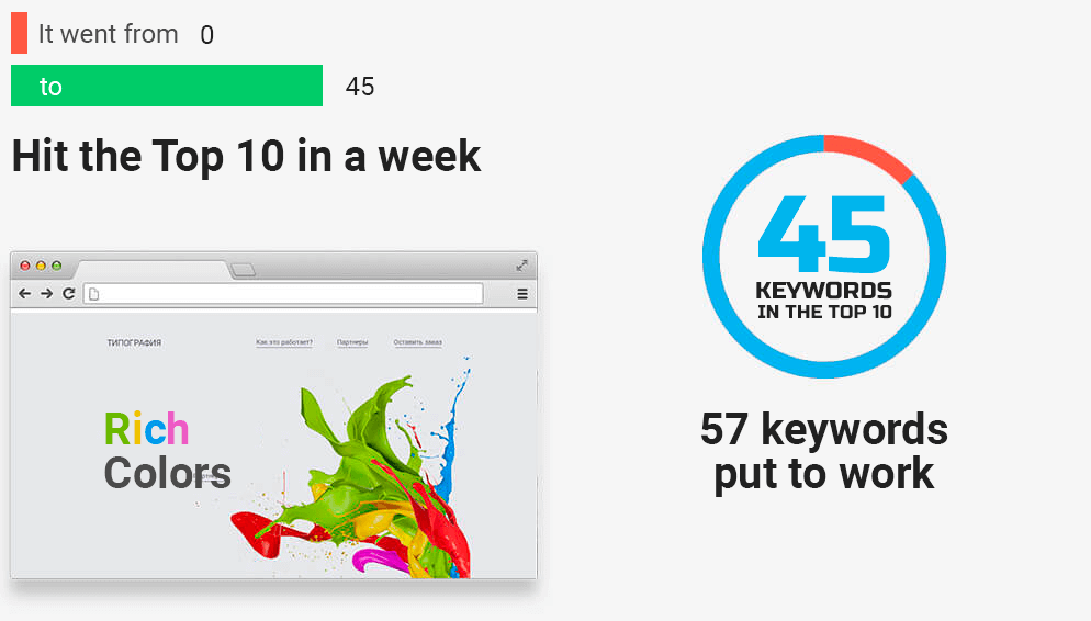 Our algorithm is based on distributed computing technology and data analysis. It leverages information about your site, its current indexing status and search engine "opinion". By maximizing the search engines' evaluation of your site through the use of key queries, we can get your website to the top in 45 days.